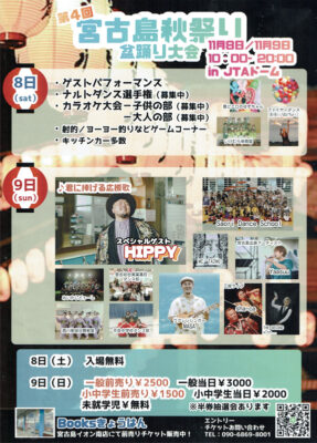 お知らせ、イベント第4回宮古島秋祭り-盆踊り大会- JTAドーム宮古島 10:00-20:00 ■2025年8月8日(土) 入場無料 ■2025年8月9日(日) 前売:一般 2500円 小中学生 1500円 未就学児 無料 当日:一般 3000円 小中学生 2000円 未就学児 無料 ●半券抽選会あり 合同学園祭 ぼくらのまつり オクトーバーフェスト2025