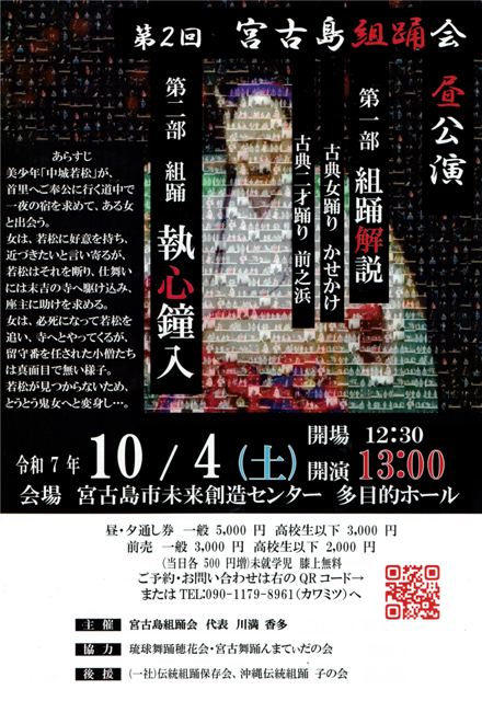 宮古島市未来創造センター 多目的ホール 【昼の部】 12:30開場 13:00開演 ■第一部 組踊解説 ●古典女踊り「かせかけ」 ●古典二才踊り「前之浜」 ■第二部 組踊「執心鐘入」 宮古島市 […]